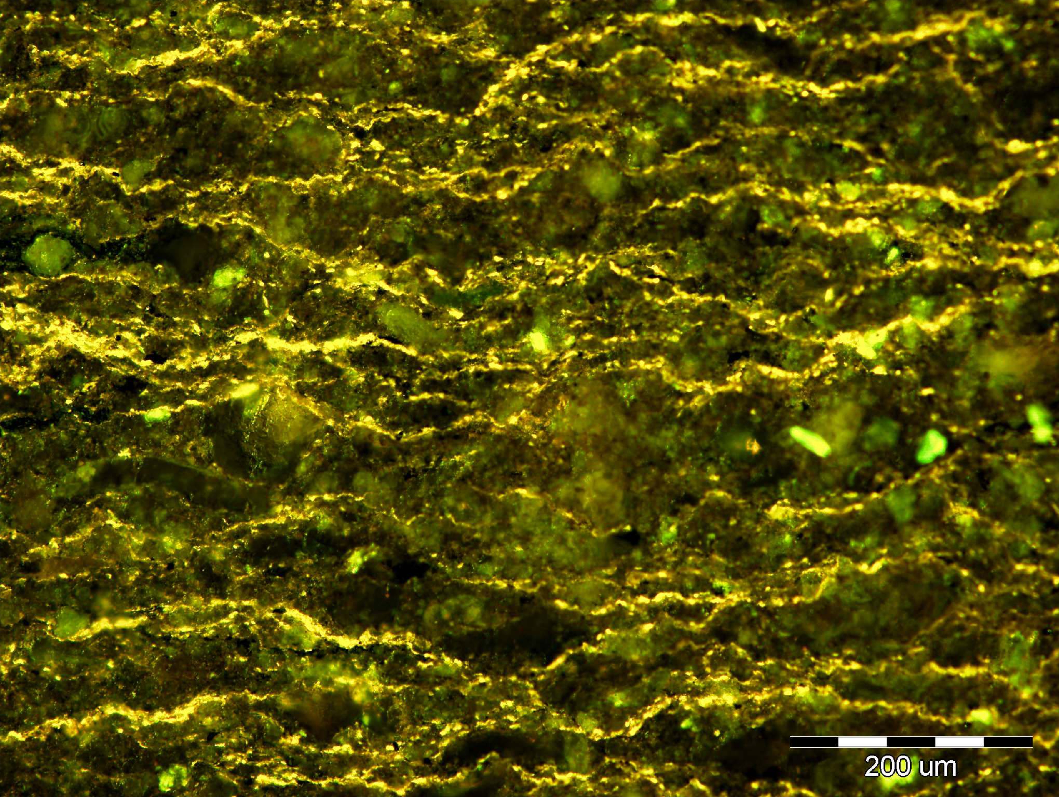 Photomicrograph of organic matter from Jurassic carbonates and shales, Lemeš Trough, Poštak Mt. Lamalginite (whole rock, perpendicular to bedding, blue-fluorescent light). For more information see the paper by TROSKOT-ČORBIĆ & TAKAČ (this Vol.).